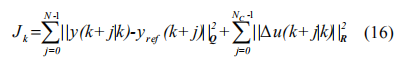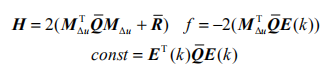 其中 yref 為參考軌跡,N 為預(yù)測(cè)時(shí)域,NC 為控制時(shí)域。Q, R 分別為誤差和輸入加權(quán)矩陣。