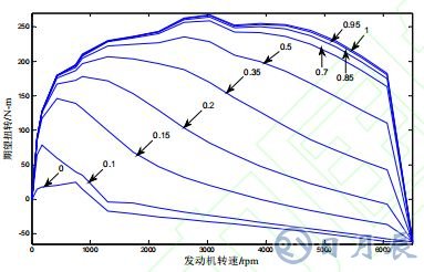 圖 2 為不同油門(mén)開(kāi)度下發(fā)動(dòng)機(jī)轉(zhuǎn)速與扭矩的關(guān)系曲線,其中每條曲線旁邊的數(shù)字對(duì)應(yīng)油門(mén)開(kāi)度。