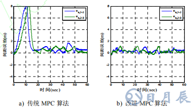 由圖 5 可知,采用傳統(tǒng) MPC 算法的自主車(chē)輛雖然能跟蹤上前車(chē)的速度,但跟蹤過(guò)程中出現(xiàn)超速和較大抖動(dòng),可能導(dǎo)致車(chē)隊(duì)的不穩(wěn)定。而采用改進(jìn)MPC 算法時(shí)后面車(chē)輛沒(méi)有超速行為,跟蹤曲線相對(duì)平滑,隊(duì)列運(yùn)行穩(wěn)定,驗(yàn)證了改進(jìn)算法的有效性。
