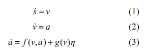 其中 s 為自主車(chē)輛相對(duì)于慣性參考點(diǎn)的縱向位置, v, a 分別為車(chē)輛的速度和加速度,η為發(fā)動(dòng)機(jī)的控制輸入。函數(shù)f 和 g 分別為: