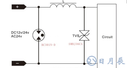 瞬態(tài)抑制二極管TVS管是普遍使用的一種新型高效電路保護器件,它具有極快的響應時間(亞納秒級)和相當高的浪涌吸收能力。當它的兩端經(jīng)受瞬間的高能量沖擊時,TVS管能以極高的速度把兩端間的阻抗值由高阻抗變?yōu)榈妥杩?,以吸收一個瞬間大電流,從而把它的兩端電壓箝制在一個預定的數(shù)值上,從而保護后面的電路元件不受瞬態(tài)高壓尖峰脈沖的沖擊。正因為如此,TVS管可用于保護設備或電路免受靜電、電感性負載切換時產(chǎn)生的瞬變電壓,以及感應雷所產(chǎn)生的過電壓。
