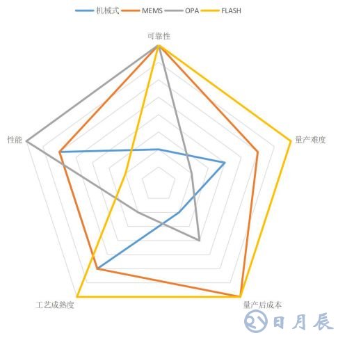 從可靠性、量產(chǎn)難度、量產(chǎn)后成本、工藝成熟度、性能等維度對機械式激光雷達、MEMS激光雷達、OPA激光雷達、Flash激光雷達進行對比如圖。