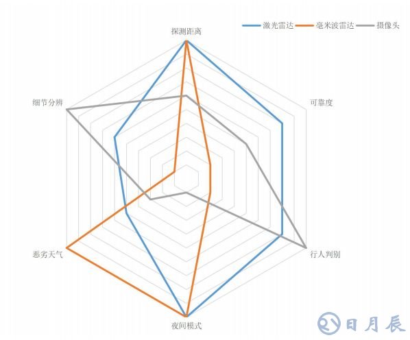 下面從探測距離、可靠度、行人判別、夜間模式、惡劣天氣、細節(jié)分辨等維度對激光雷達、毫米波雷達、攝像頭三種傳感器的性能進行對比如下圖。
