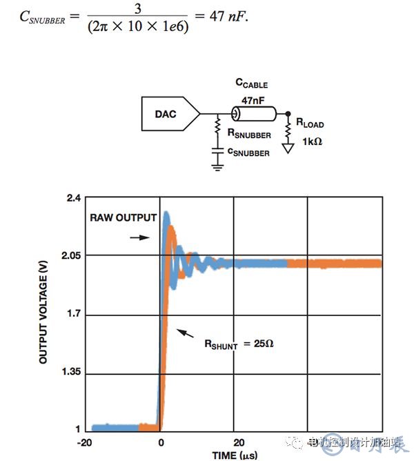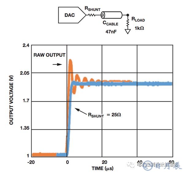 RSHUNT法需要的外部組件最少,其背后的原理相對簡單;通過在運算放大器與負載之間放置分立式電阻使二者相隔離。RSHUNT在反饋網(wǎng)絡(luò)的傳遞函數(shù)中增加一個零,結(jié)果使閉環(huán)在高頻下能保持穩(wěn)定。選擇的這個零應(yīng)至少比GBP (增益帶寬積)低一個十倍頻程。但這里的問題是,DAC的技術(shù)規(guī)格不包括這個數(shù)字,原因是其不相關(guān),因為內(nèi)部運算放大器充當(dāng)?shù)氖蔷彌_器。