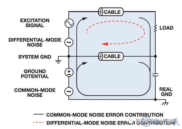 第二種,也是最麻煩的噪聲是差模噪聲,這種噪聲是在激勵與系統(tǒng)GND之間耦合的。該噪聲之所以會耦合到信號中,是因為系統(tǒng)GND與充當(dāng)天線的信號電纜之間存在電流環(huán)路。在部分應(yīng)用中(如化學(xué)分析),出于安全考慮,傳感器有時置于獨立于控制器的腔室中。這種設(shè)置會導(dǎo)致數(shù)十或數(shù)百米的電流環(huán)路,結(jié)果,任何磁通量都可能在信號中導(dǎo)致電流噪聲,從而使數(shù)據(jù)遭到破壞。為了減少差模噪聲的影響,建立使用鐵氧體材料來過濾高頻輻射信號,在控制器與傳感器之間采用星型連接,同時還要使用屏蔽電纜。