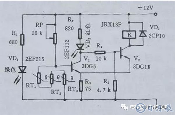 當電機因故障局部過熱時,只要有一只PTC熱敏電阻受熱超過預設溫度時,其阻值就會超過10KΩ以上。 于是V1導通、V2截止,VD2顯示紅色報警,K失電釋放,電機停止運轉(zhuǎn),達到保護目的。