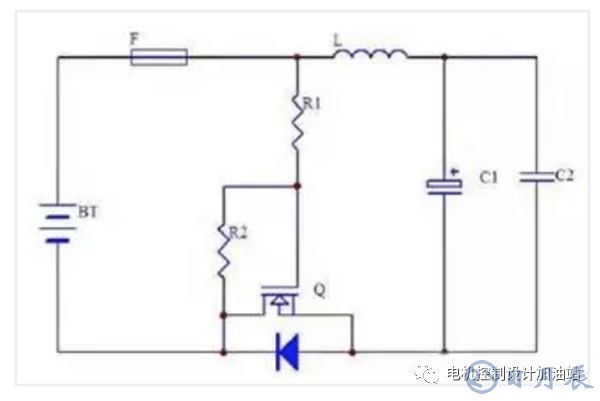 圖中D為防反接MOS的寄生二極管,便于分析原理畫出來了。當電池極性未接反時,D正偏導通,Q的GS極由電池正極經(jīng)過F、R1、D回到電池負極得到正偏而導通。Q導通后的壓降比D的壓降小得多,所以Q導通后會使D得不到足夠的正向電壓而截止。