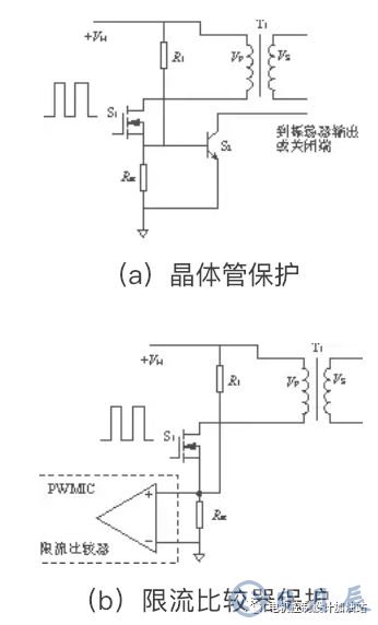 在變壓器初級直接驅(qū)動的電路(如單端正激式變換器或反激式變換器)的設計中,實現(xiàn)限流是比較容易的。圖2是在這樣的電路中實現(xiàn)限流的兩種方法。