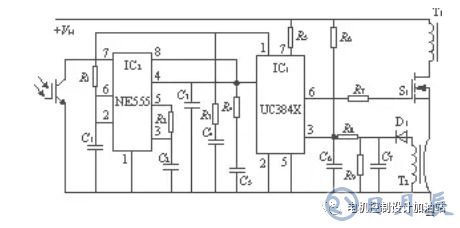 圖6為用555做限流保護的電路,其工作原理如下:UC384X與S1及T1組成一個基本的PWM變換器電路。UC384X系列控制IC有兩個閉環(huán)控制回路,一個是輸出電壓Vo反饋至誤差放大器,用于同基準電壓Vref比較之后產(chǎn)生誤差電壓(為了防止誤差放大器的自激現(xiàn)象產(chǎn)生,直接把腳2對地短接);另一個是變壓器初級電感中的電流在T2次級檢測到的電流值在R8及C7上的電壓,與誤差電壓進行比較后產(chǎn)生調(diào)制脈沖的脈沖信號。