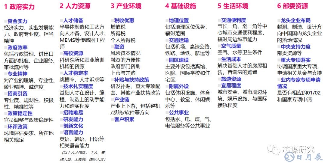 針對地方政府發(fā)展半導體的關鍵戰(zhàn)術要素拆解,芯謀研究也做了仔細的工作,細分了六大關鍵性成功因素:
