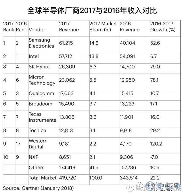 2019年1月7日,Gartner關(guān)于全球半導(dǎo)體廠商2018年收入的數(shù)據(jù)公開之后,三星電子以15.9%的市場份額,繼續(xù)穩(wěn)住了全球半導(dǎo)體產(chǎn)業(yè)中廠商年收入排名第一的地位。