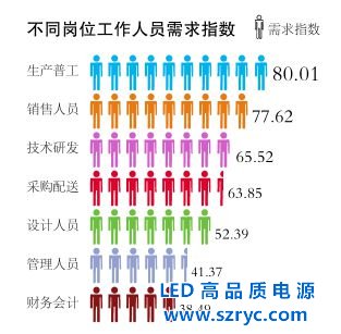而在這其中,哪些崗位需求量最大?通過調研企業(yè)不同崗位招聘人數(shù)統(tǒng)計發(fā)現(xiàn),“生產一線普工”和“銷售人員”需求量位于前列,需求指數(shù)分別為80.01和77.62,與其它制造行業(yè)類似,“生產一線普工”仍是不少照明企業(yè)需求量最大的崗位。此外,“技術研發(fā)類”、“采購配送類”崗位需求量也不小,如一聲喊照明今年啟動招聘的593人當中,配送員就高達200人,當然這與其企業(yè)所處階段和發(fā)展模式有關。相較而言,“管理人員”、“財務會計類人員”相對穩(wěn)定,需求量相對較小。