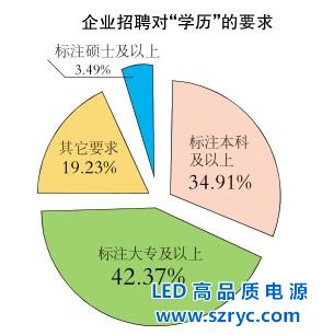 小編有話說從以上統(tǒng)計數(shù)據(jù)可知,整體而言,照明企業(yè)對應聘者的學歷要求并不算高。照明企業(yè)在招聘當中對學歷的要求最多的為大專及以上學歷(42.37%),要求本科以上學歷的僅次于大專,要求碩士及以上學歷的僅為3.49%,而“其它要求(如中專、高中)”的比例達到19.23%。其中,生產普工等一線員工的學歷要求多在大專以下學歷,甚至沒有學歷要求;而要求本科及以上學歷的崗位多是高級工程師、技術、管理等崗位,這些崗位多是企業(yè)管理級別以上。