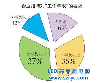 在“工作年限”方面,照明企業(yè)更傾向于招聘具有一定相關工作經驗的人員,其中要求“1年以上”和“2年以上”的崗位較多,占比分別為35%和37%;無工作年限要求的占比16%;而要求5年以上經驗的崗位,則為管理人員和高級技術人員等。