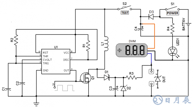如圖是一個(gè)齊納二極管測試電路,用于測量未知齊納二極管的電氣特性。其中U1為NE555N,DVM為數(shù)字電壓表。