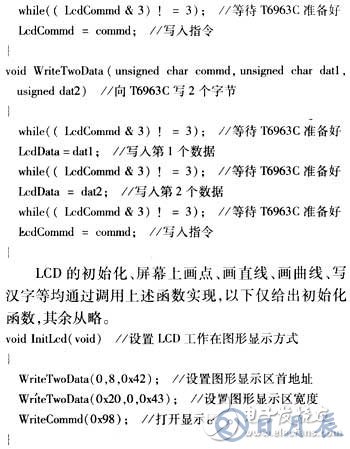 接口軟件用HI-TECH C編寫,分成為應(yīng)用程序提供服務(wù)的接口函數(shù)和訪問硬件的驅(qū)動(dòng)程序等兩個(gè)層次,接口函數(shù)通過調(diào)用驅(qū)動(dòng)程序?qū)崿F(xiàn)初始化、漢字、圖形等的顯示。