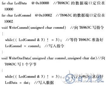 根據(jù)對(duì)T6963C的指令系統(tǒng)的分析可知,指令有雙字節(jié)數(shù)據(jù)、單字節(jié)數(shù)據(jù)和無(wú)數(shù)據(jù)等,在對(duì)T6963C進(jìn)行讀寫之前其必須根據(jù)其狀態(tài)寄存器來(lái)判斷是否可以進(jìn)行操作,以下為底層的3個(gè)寫指令/數(shù)據(jù)的函數(shù)和初始化函數(shù):