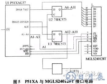 需要注意的是,P51XA的外部總線進(jìn)行了優(yōu)化,地址的低4位A0-A3不是分時(shí)復(fù)用的及在外部總線設(shè)為16位的情況下不需要地質(zhì)線A0,此時(shí)A0作為高位數(shù)據(jù)的寫信號(hào)線--WRH,而原來(lái)的WR作為低8位數(shù)據(jù)的寫信號(hào)線--WRL,在擴(kuò)展8位的外部接口器件的時(shí)一般盡量安排在偶地址。LCD的模塊MGLS240128T可以直接與P51XA總線實(shí)現(xiàn)接口,其邏輯圖見圖5所示,這里就MGLS240128T連接在XA數(shù)據(jù)總線的低8位,寫入時(shí)用WRL控制信號(hào)線,XA地址總線的A1用做MGLS240128T的CD控制,根據(jù)系統(tǒng)的具體安排,用XA地址線的高位譯碼后驅(qū)動(dòng)MGLS240128T的片選線。