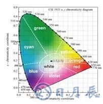 眾所周知,由紅(Red)、綠(Green)、藍(lán)(Blue)三基色可合成白光,如圖24所示。該圖為1931色度圖,三角形中央虛線區(qū)為白光區(qū)。氮化鎵LED一般只能發(fā)出一種顏色的光。白光照明也要通過RGB三基色的合成來實現(xiàn)。RGB三基色可以直接靠LED發(fā)射三基色光,也可用LED去激發(fā)熒光物質(zhì),通過二次光轉(zhuǎn)換獲得三基色光或準(zhǔn)三基色光。
