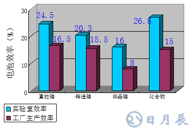 不同的半導(dǎo)體材料在實驗室和產(chǎn)業(yè)中制成的太陽電池效率