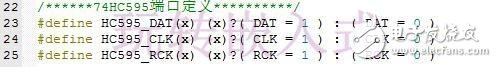 與單片機(jī)相連接的三個(gè)腳分別為:HC_DAT,HC_RCK,HC_CLK。兩片595采用級(jí)聯(lián)方式,即U2的第9腳接到U3的第14引腳。