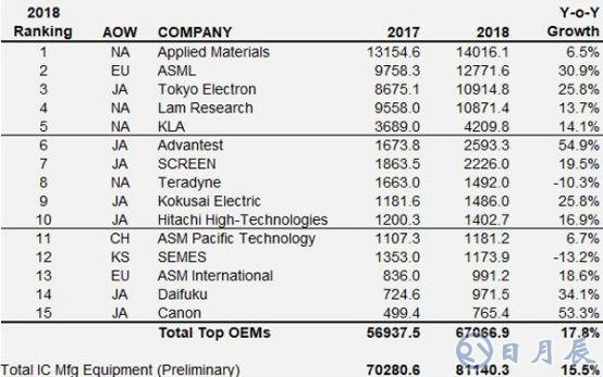 從該榜單來看,日本廠商占據(jù)7家,東京電子(TEL)排名第3、排名第6的是愛德萬測(cè)試(Advantest)、第7名是SCREEN,第9名的是KOKUSAI ELECTRIC、第10名的是日立High Technology、第14名是大福(DAIFUKU)、最后排名第15的是佳能。從地區(qū)來看,美國(guó)廠商有4家、歐洲廠商有3家,中國(guó)和韓國(guó)各有1家,可以說日本企業(yè)在半導(dǎo)體生產(chǎn)設(shè)備業(yè)界的奮斗著實(shí)引人注目。Top1依舊和歷年一樣是美國(guó)的Applied Materials(AMAT),2018年的銷售額比2017年增加了6.5%,增加至140億美金(約人民幣952億元),但是,AMAT的增長(zhǎng)率(6.5%)與半導(dǎo)體生產(chǎn)設(shè)備業(yè)界15.5%的增長(zhǎng)率相比,是比較低的。