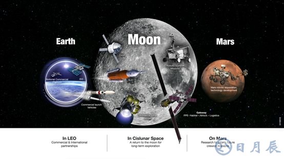 2019年3月底,美國國家航空航天局局長吉姆布里登斯廷在聽證會上宣布,將在2022年之前將第一次載人飛行任務(wù)送到月球附近,并在2024年載人登陸月球的南極。同時,美國國家航空航天局為未來的探索活動制定了一個明確的計劃,涉及戰(zhàn)略領(lǐng)域:低地球軌道,月球、火星以及深空。