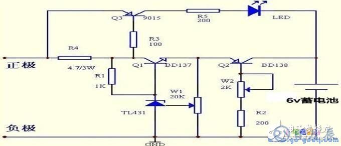 輸入直流電壓高于所充電池電壓8伏即可。如圖3中R1、Q1、W1、TL431組成精密可調(diào)穩(wěn)壓電路,Q2、W2、R2構(gòu)成可調(diào)恒流電路,Q3、R3、R4、R5、LED為充電指示電路。隨著被充電池電壓的上升,充電電流將逐漸減小,待電池充滿后R4上的壓降將降低,從而使Q3截止,LED將熄滅。為保證電池能夠充足,在指示燈熄滅后繼續(xù)充(1—2)h。使用時(shí)給Q2、Q3裝上合適的散熱器。本電路的優(yōu)點(diǎn):制作簡單,元器件易購,充電安全,顯示直觀,并且不會(huì)損壞電池。通過改變W1可以對(duì)多節(jié)串聯(lián)鋰電池充電,改變W2可以對(duì)充電電流進(jìn)行大范圍調(diào)節(jié)。缺點(diǎn)是無過電流放電控制電路。