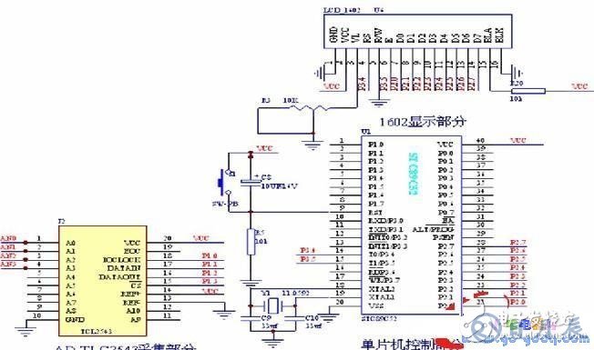 STC89C51和12的AD芯片TCL2543功能滿足要求價(jià)格便宜。顯示部分用1602顯示檢測的電壓和電流。