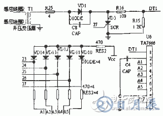 負載短路時。電線電流變得很大,使磁感線圈上產(chǎn)生的感應(yīng)電壓升得很高,這時。磁感線圈獲得的電壓遠遠大于0.15V,TA7666的3、4、5、6、7腳同時輸出低電平,控制過程與前述相同,電磁開關(guān)立即切斷電源。保證用電戶電器設(shè)備的安全。3.3 超壓保護電路工作原理