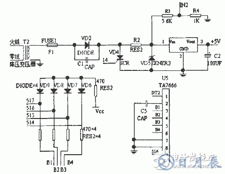 當干線電壓由220V變?yōu)?80V時。變壓器輸出的5V變?yōu)?.5V。TA7666的3、4、5、6、7全為低電平。電磁開關(guān)立即切斷電源以保護用電設(shè)備。另外,由于TA7666的7腳是高電平。VD2的控制腳為高電平,VD2導(dǎo)通,保護儀器不受損壞。電路圖中的C1,C2為大電解電容,其作用是當干線被切斷后。由于Cl,C2充有電壓。使儀器七的信號保留一定時間,即延遲作用。
