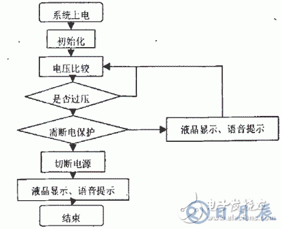 當干線電壓過高時,變壓器T2輸出的電壓超過5V,經(jīng)整流濾波后加至TA7666。使3腳輸出高電平。由PC3輸入8255,8255得劍干線電壓過高信號。從字符存儲器中調(diào)出原來存儲的電壓過高的寧信息。由PA0~PA7輸出到HD44780字符液晶顯示模塊。于是。HD44780字符液晶顯示模塊開始顯示電壓過高。不安全的語句。同時,8255也從存儲器中調(diào)出干線電壓過高的語音信息。由PB0.PB7輸出送到ISD2650語音芯片,此時ISD2650語音芯片驅(qū)動揚聲器發(fā)出5句電壓過高。不安全”的報警聲音。提示用戶注意用電的安全。但這只足提示,不切斷電。當干線電壓超過270V時,變壓器次級輸出為5.6V,這時TA7666的5腳。由原來高電乎變?yōu)榈碗娖?。這時除字符和語音提示外。同時?;蜷T電路也輸出切斷電源的控制信號,由電磁開關(guān)切斷干線電流。