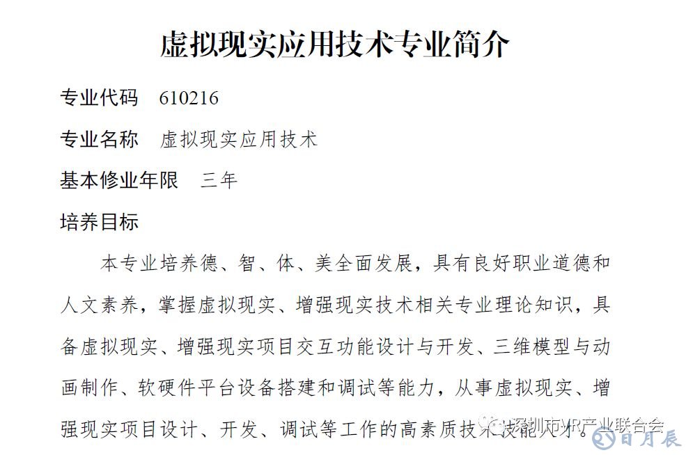 根據(jù)公告,“虛擬現(xiàn)實(shí)應(yīng)用技術(shù)”專業(yè)歸屬電子信息專業(yè)大類,專業(yè)類為計算機(jī)類,專業(yè)代碼為610216。在附件文件的簡介中,深圳vr產(chǎn)業(yè)聯(lián)合會發(fā)現(xiàn),文件是這樣描述“虛擬現(xiàn)實(shí)應(yīng)用技術(shù)”專業(yè)的: