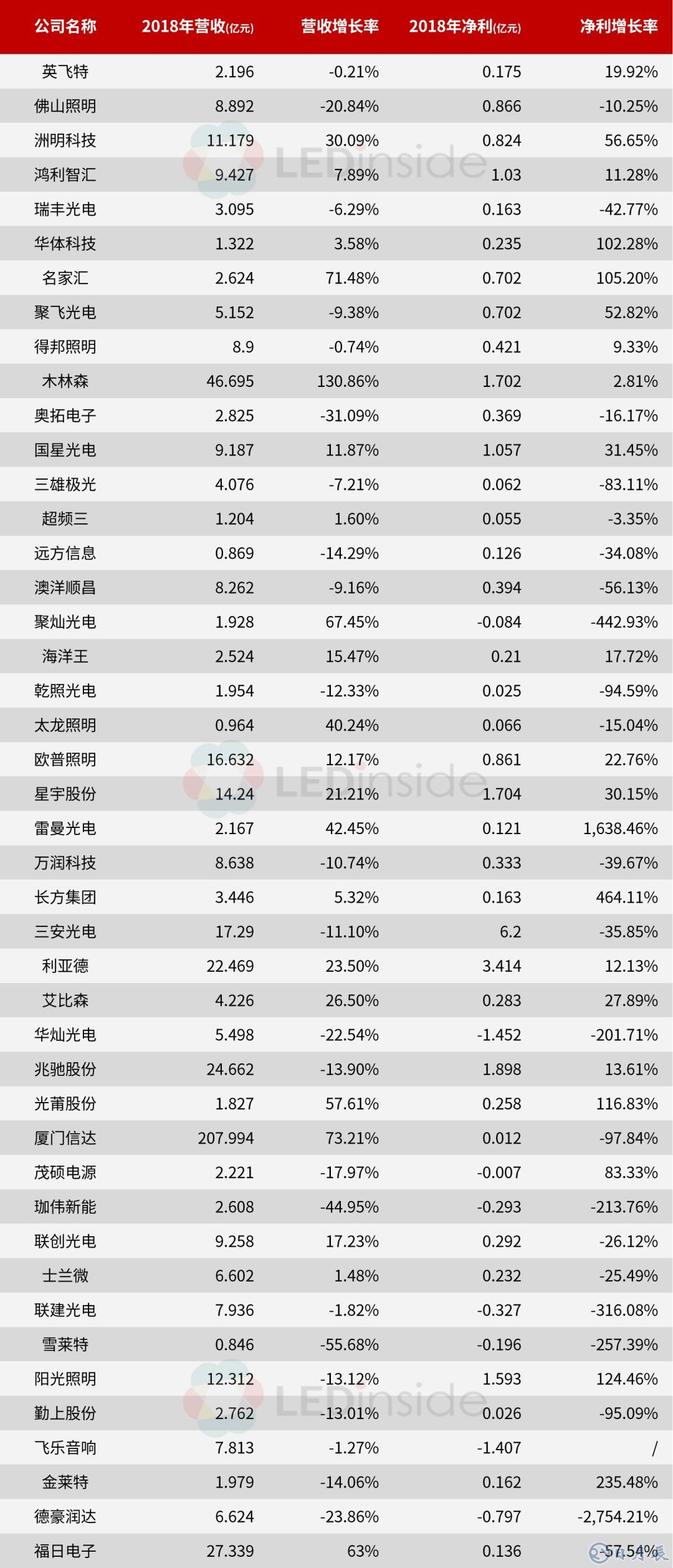 從營收來看,44家LED上市企業(yè)中有21家取得了營收增長,占比47.7%,木林森以增長率130.86%排在首位,主要原因是合并了Ledvance報表。營收前十的分別為廈門信達(dá)、木林森、福日電子、兆馳股份、利亞德、三安光電、歐普照明、星宇股份、陽光照明、洲明科技,營收皆為10億以上。