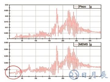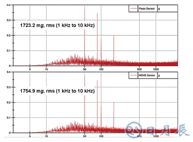 圖2顯示了21 kHz諧振頻率的MEMS加速度計和25 kHz諧振頻率的PZT傳感器的頻譜測量結果。MEMS加速度計在1 Hz至1 kHz頻段中的均方根(rms)輸出要比PZT加速度計高出大約30 mg或1.7%。