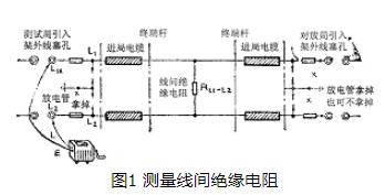 (1) 按圖1所示連接線路。雙方局將被測線路在局內(nèi)保安器上的放電管拿掉,并將引入架外線塞子拔掉,以切斷被測線路的電源。然后測試局將兆歐表“L”接線柱和“E”接線柱的引線分別連接到被測線路的L1和L2導(dǎo)線上。兆歐表一般使用250V額定輸出電壓型,因為采用500V型的兆歐表必須將雙方終端桿保安器的放電管去掉,否則放電管要放電,造成測試誤差;