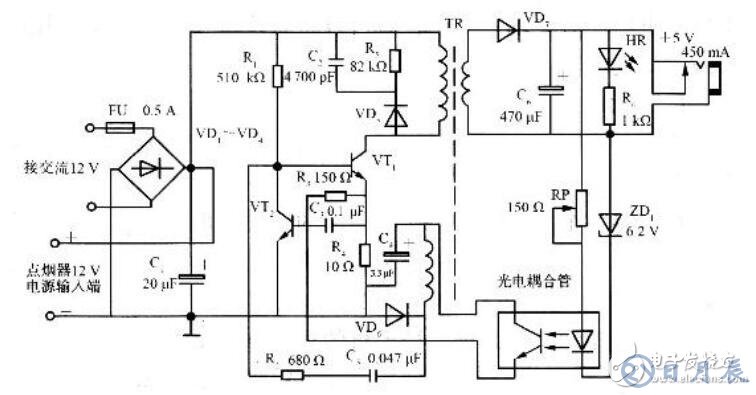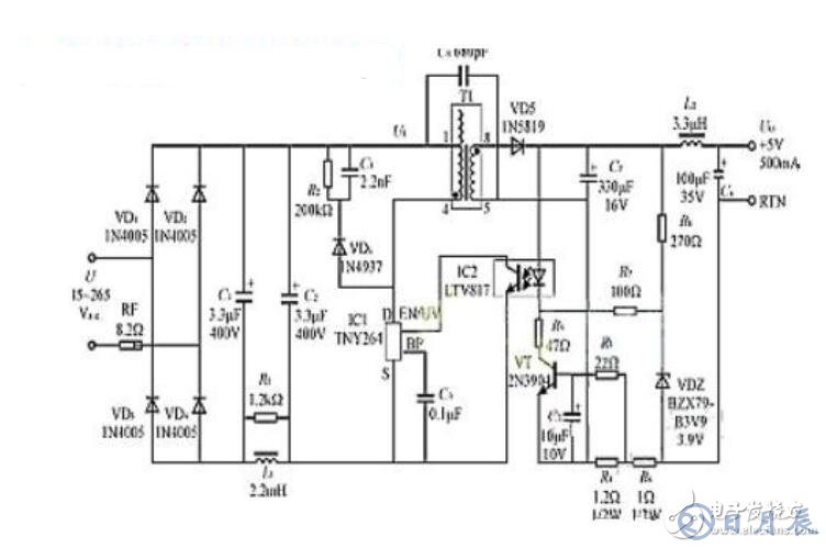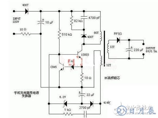 而下方的1KΩ電阻跟串聯(lián)的2700pF電容,則是正反饋支路,從取樣繞組中取出感應(yīng)電壓,加到開關(guān)管的基極上,以維持振蕩。右邊的次級(jí)繞組就沒有太多好說(shuō)的了,經(jīng)二極管RF93整流,220uF電容濾波后輸出6V的電壓。沒找到二極管RF93的資料,估計(jì)是一個(gè)快速回復(fù)管,例如肖特基二極管等,因?yàn)?u style="color: rgb(51, 51, 51) !important;">開關(guān)電源的工作頻率較高,所以需要工作頻率的二極管。這里可以用常見的1N5816、1N5817等肖特基二極管代替。
