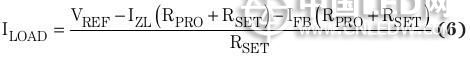 當(dāng)負(fù)載電流通路被移除時(shí),輸出電壓上升,直到齊納二極管 ZD1 開(kāi)啟,同時(shí)電流流經(jīng) RPRO和 RSET接地。輸出電流由 RPRO和 RSET的串聯(lián)組合決定,因?yàn)?VFB受到驅(qū)動(dòng)后等于內(nèi)部帶隙參考電壓 VREF。因此,輸出保護(hù)電流默認(rèn)為: