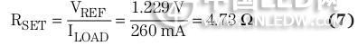升壓轉(zhuǎn)換器經(jīng)過(guò)配置,用于驅(qū)動(dòng) 3 支高亮度白光 LED(260 mA)。典型參考電壓為 1.229 V 時(shí),將簡(jiǎn)化的負(fù)載電流用于方程式7中,計(jì)算得到RSET: