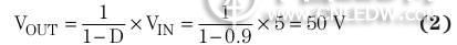 這種簡(jiǎn)單實(shí)施方法存在的一個(gè)嚴(yán)重問(wèn)題是,LED 串中出現(xiàn)的開(kāi)路故障會(huì)移除負(fù)載電流的通路。當(dāng)沒(méi)有電流流過(guò)反饋電阻器 RSET時(shí),VFB被下拉至接地。作為響應(yīng),升壓轉(zhuǎn)換器會(huì)盡可能地增加其工作占空比至最大值,目的是在反饋 (FB)針腳上維持正確的電壓。利用理想化的升壓轉(zhuǎn)換器傳輸函數(shù)表明,當(dāng)轉(zhuǎn)換器接近其最大占空比時(shí),可以產(chǎn)生高輸出電壓 (VOUT)。請(qǐng)思考一個(gè)90%(常用值)典型最大占空比且 5V 輸入的升壓轉(zhuǎn)換器: