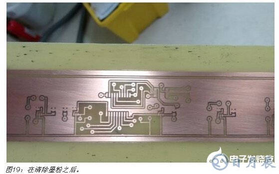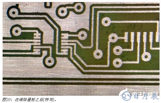 現(xiàn)在可以用丙酮等溶劑清除墨粉/密封材料了。但不要錯(cuò)誤地使用浸過(guò)丙酮的毛巾去擦試電路板。這樣做將不可挽回地將墨粉弄進(jìn)電路板,使電路板非常難看。相反,要將整塊電路板浸到丙酮桶中,等待2至3分鐘的時(shí)間使之滲透到墨粉中,在仍浸潤(rùn)于丙酮之時(shí),使用軟鬃毛刷子將墨粉脫離電路板。在將所有墨粉完全從電路板分離之前,不要將電路板從丙酮液中拿出來(lái)。有些墨粉可能仍然粘在電路板上,但這似乎是無(wú)法避免的。