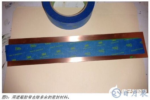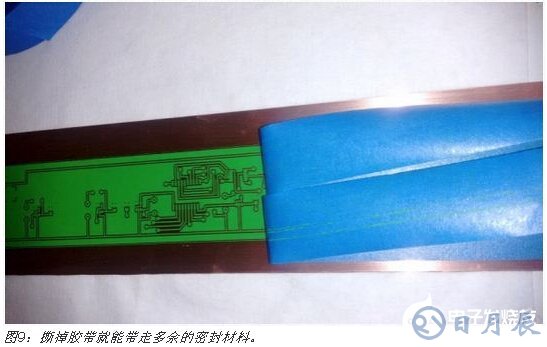 買一卷3M的潔凈遮蔽膠帶,將它粘貼到電路板的兩個(gè)整表面。用一個(gè)復(fù)印滾筒或有力的指壓將它牢牢粘貼到走線中。然后將膠帶撕掉。這樣就能去除不在原始碳粉表面的所有多余密封材料。這一步也會(huì)讓你相信,碳粉和密封材料非常牢固,不是那么容易就能擦除掉。
