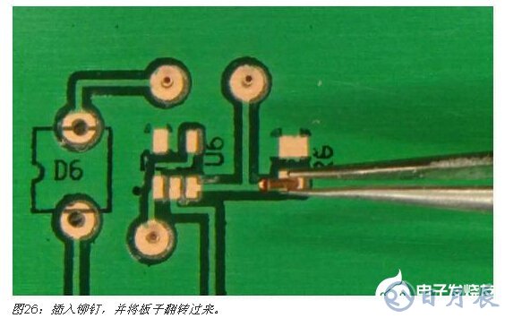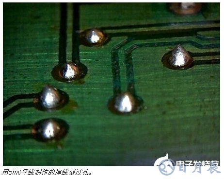焊線是連接過(guò)孔的最簡(jiǎn)單方法,但它會(huì)留下像大橡樹(shù)果一樣的突起物,即使用平頭鋼絲鉗剪過(guò)。這些接點(diǎn)不僅難看,而且在這些過(guò)孔上方不能再放置元件。然而這是目前最為簡(jiǎn)單的過(guò)孔制作方法。