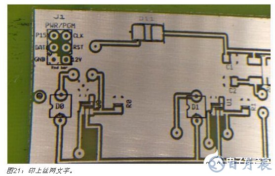 這一步是將一些標(biāo)記和文字印到電路板上,不過(guò)不是用傳統(tǒng)的絲網(wǎng)印刷方法,而是用同樣的墨粉轉(zhuǎn)印技術(shù),利用以前鉆好的對(duì)齊標(biāo)記將圖案打印到電路板上。因?yàn)樵诮?jīng)過(guò)銅蝕刻后表面不是完全平坦,位于銅箔邊緣的一些圖案將無(wú)法正確轉(zhuǎn)印。為了盡量減少問(wèn)題,設(shè)計(jì)應(yīng)盡可能避免跨越蝕刻區(qū)的邊界。