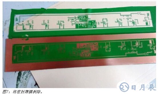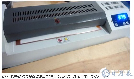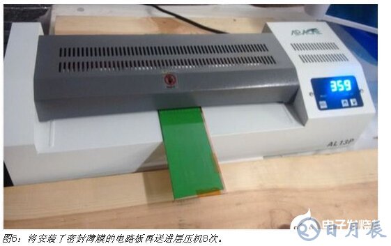 將層壓機(jī)開(kāi)機(jī),經(jīng)過(guò)大約15分鐘后達(dá)到全熱狀態(tài)。然后從全部4個(gè)邊的方向送板子進(jìn)去。我們不能認(rèn)為頂面和底面會(huì)同等加熱,因此最好將板子翻過(guò)來(lái),再送4次。也就是說(shuō)總共送8次進(jìn)層壓機(jī)。結(jié)束后在空氣中冷卻一會(huì)兒,再朝紙上噴一些水。脫模劑應(yīng)變得具有活性,不用費(fèi)力那些紙就能自己分開(kāi)來(lái)。然后將膠帶小心的撕下來(lái),將紙丟掉。將電路板放在干凈的自來(lái)水中沖幾分鐘。這一步很重要。我們必須徹底清除粘在碳粉轉(zhuǎn)印紙上的脫模劑,否則它會(huì)影響下一步密封材料的粘貼。
