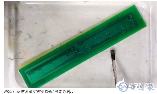 將電路板浸入顯影劑溶液中,用鬃毛刷輕輕地刷洗。規(guī)范要求溶液加熱到90°F (32°C),但那樣做似乎顯影速度太快了。當(dāng)溶液溫度較低時(shí)更好控制,只需花大約5分鐘的時(shí)間就能完成顯影。過(guò)長(zhǎng)的顯影時(shí)間會(huì)使得膜變得太軟,并且邊緣參差不齊,因此仔細(xì)監(jiān)視整個(gè)過(guò)程很重要。