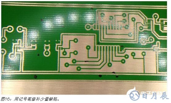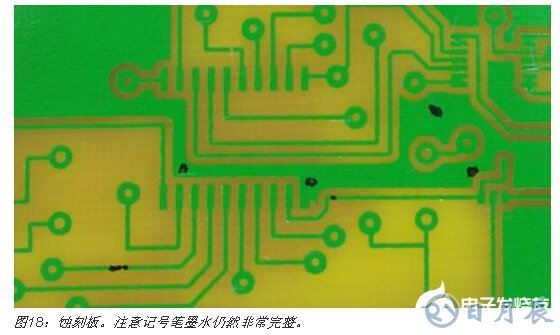 接下來(lái)要仔細(xì)檢查走線中是否有任何斷點(diǎn)和針孔。這些斷點(diǎn)和針孔很容易用精細(xì)的記號(hào)筆加以修繕。記號(hào)筆的墨水似乎與蝕刻劑結(jié)合得非常好。