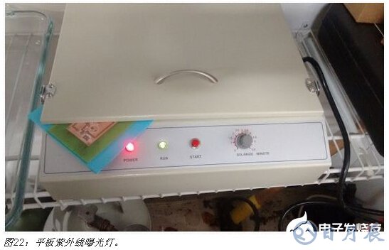 現(xiàn)在萬(wàn)事俱備,可以用紫外光照射阻焊層了。這時(shí)需要一個(gè)紫外燈。對(duì)于小板子來(lái)說(shuō),美甲燈就行了,價(jià)格是20美元。對(duì)于大板子而言,需要一個(gè)平板型的紫外線燈,價(jià)格大約75美元。平板燈之所以好,是因?yàn)樯w板有個(gè)鎖止裝置,可以將幻燈片壓在電路板上,提高圖像的分辨率。