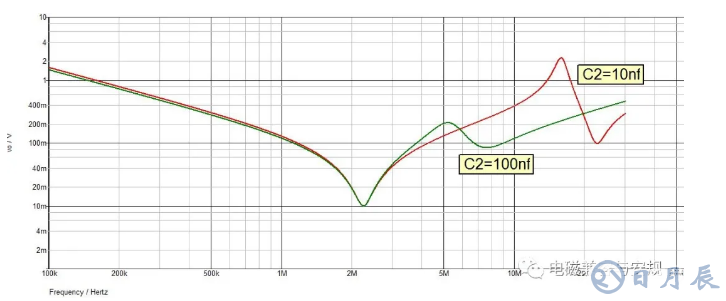 (2)增大電容的寄身電阻ESR,減小并聯(lián)諧振的品質(zhì)因數(shù),如將C1電容的ESR由10m歐變?yōu)?00m歐,仿真結(jié)果如下圖所示。