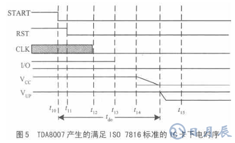 圖5為IC卡的下電時(shí)序圖。相對(duì)于上電時(shí)序,下電過程對(duì)時(shí)間的要求不是很嚴(yán)格,只要設(shè)計(jì)者控制TDA8007按照一定的順序置低START、RSTIN和停止CLK即可,然后TDA8007會(huì)自動(dòng)逐步釋放RST、I/O、Vcc及VUP。具體處理見下電程序。